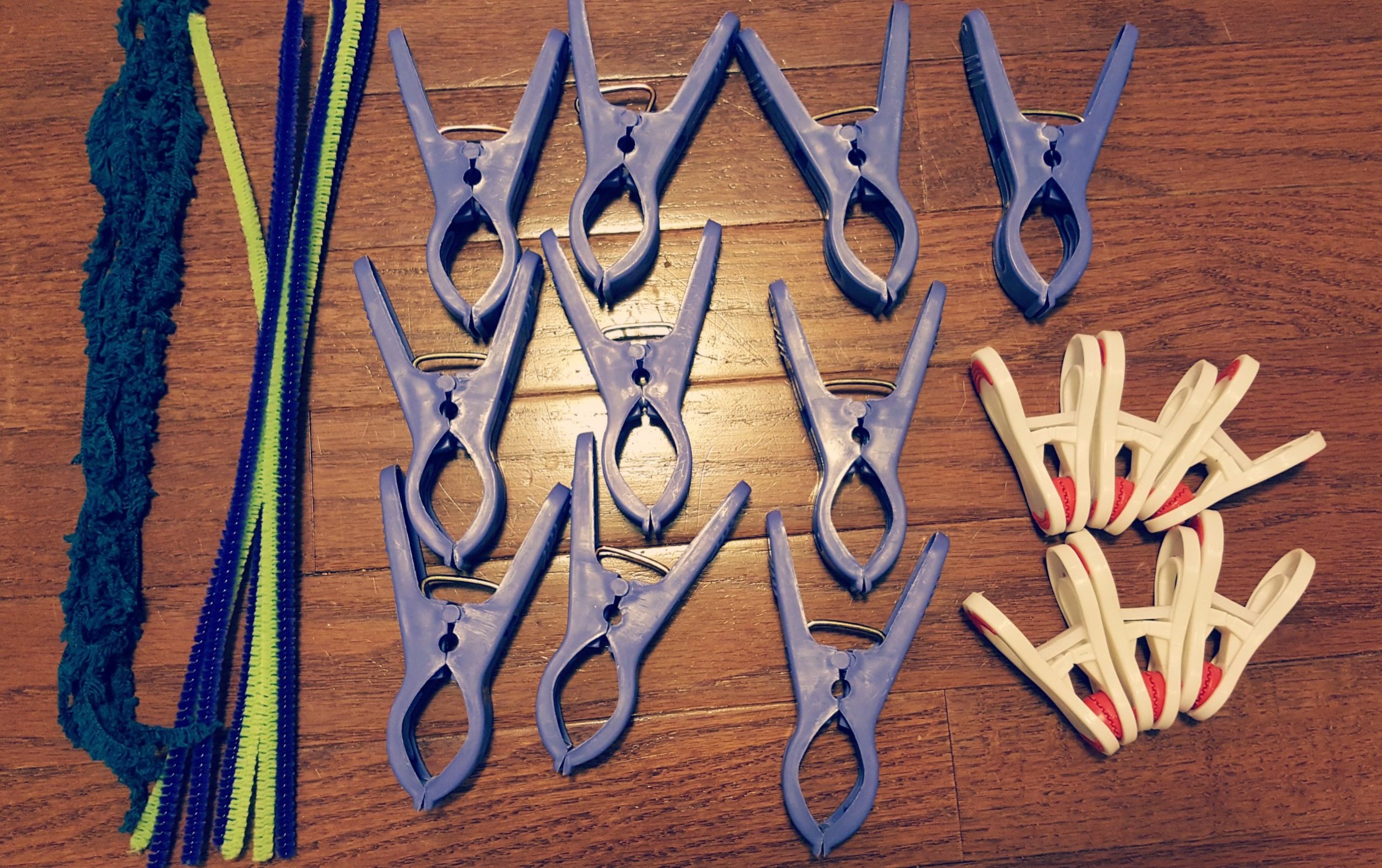 I split the class into 6 groups, of 5 children per group. Each group got a bin of heavy duty clothes pins, pipe cleaners, pieces of string, and an assortment of sticks (about 10 strong sticks, just over a meter long, and 10 shorter, thinner sticks/twigs).