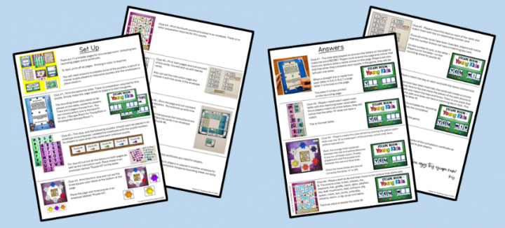 All of the puzzles featured above are available at the bottom of this page for free. The set up instructions and puzzle solutions are described above; however, if you prefer a hard copy of the instructions and answers, they are available through Hands-On Teaching Ideas below.